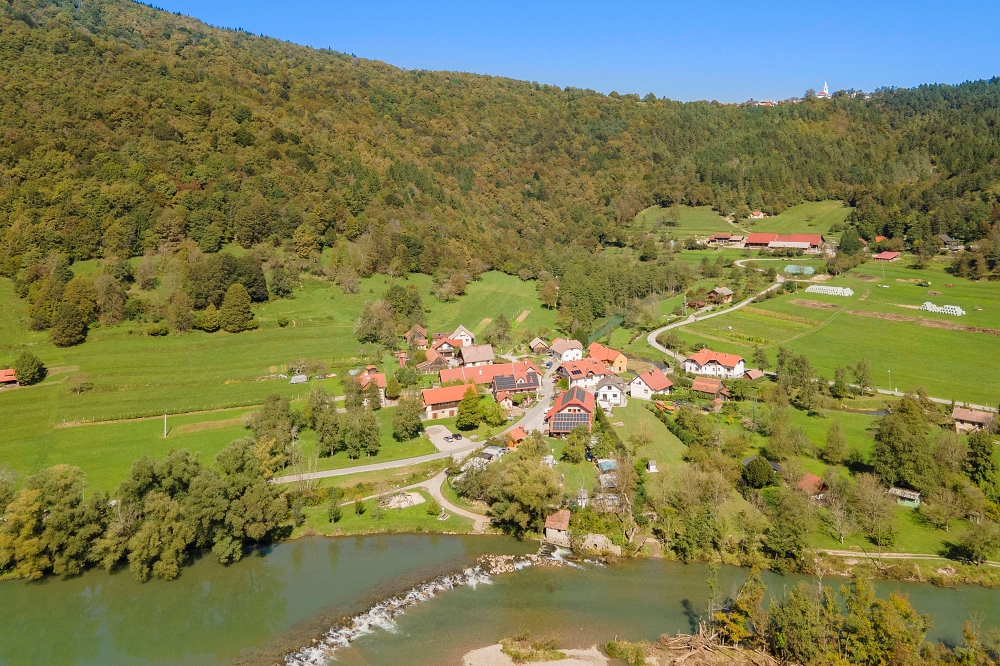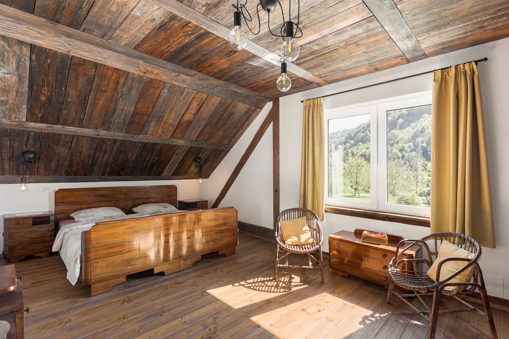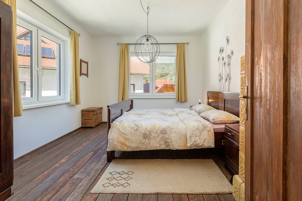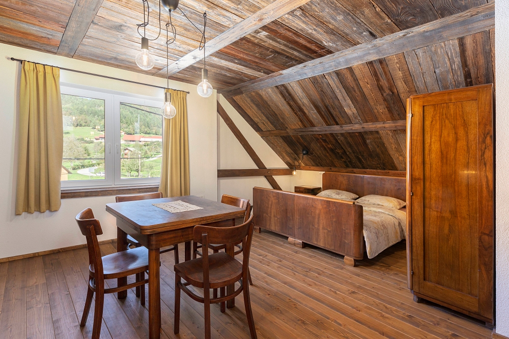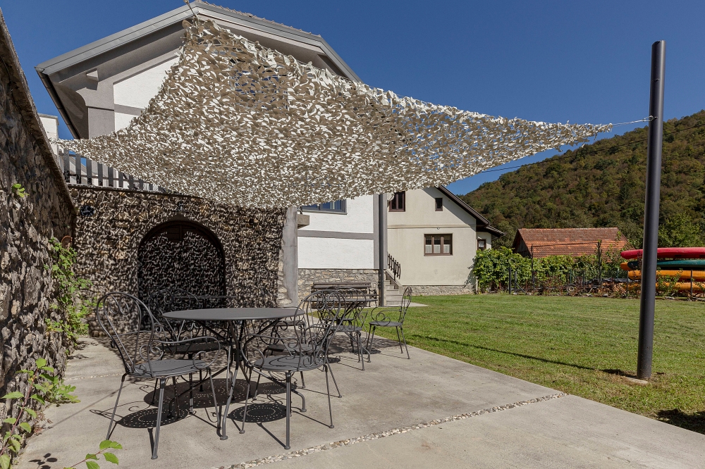 The living space (70 m2) includes 2 bedrooms, a kitchen, a dining room, a living room and a bathroom. The central part of the house is an open space occupied by the kitchen, the dining room and the living room. There are two distinct elements that connect all three rooms: the traditional brick oven and the hardwood floor made of recycled larch planks, which also decorate the kitcken cupboards. The traditional hardwood floor extends in both bedrooms which are also equipped with brick ovens and double beds. The attic is an open-space sleeping area (70 m2) with additional 2 double beds and 4 twin beds. The whole house is equipped with period furniture, some of which originally belonged to the house, however most of it is second-hand and fully restored. The terrace next to the kitchen offers wonderful views of a large garden which extends to the Kolpa River. A garage for storing bicycles and fishing equipment is also available to the guests. The garden is actually a motorhome area for three motorhomes with water, and electricity supply, free WiFi and enough parking space for all the guests.