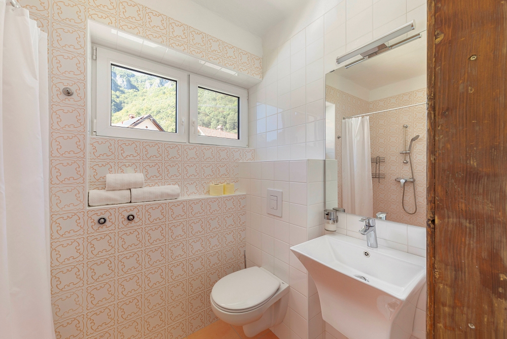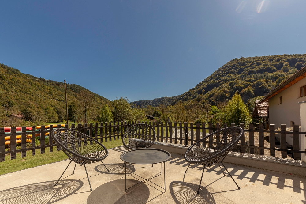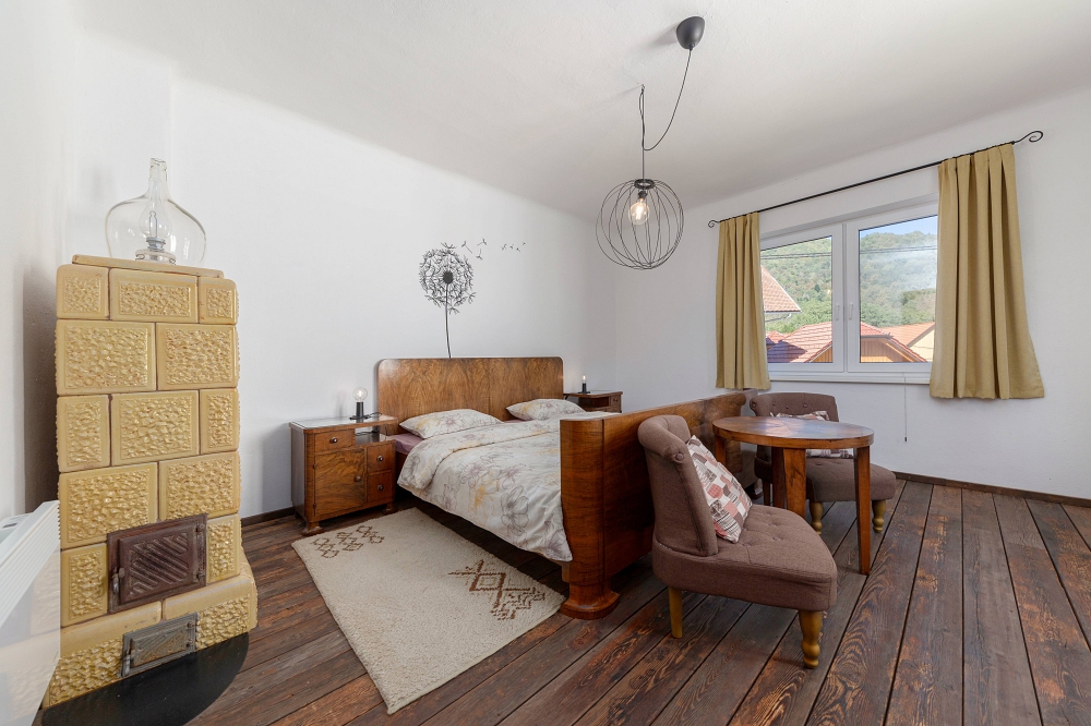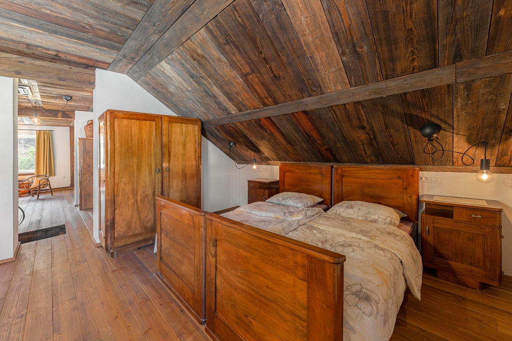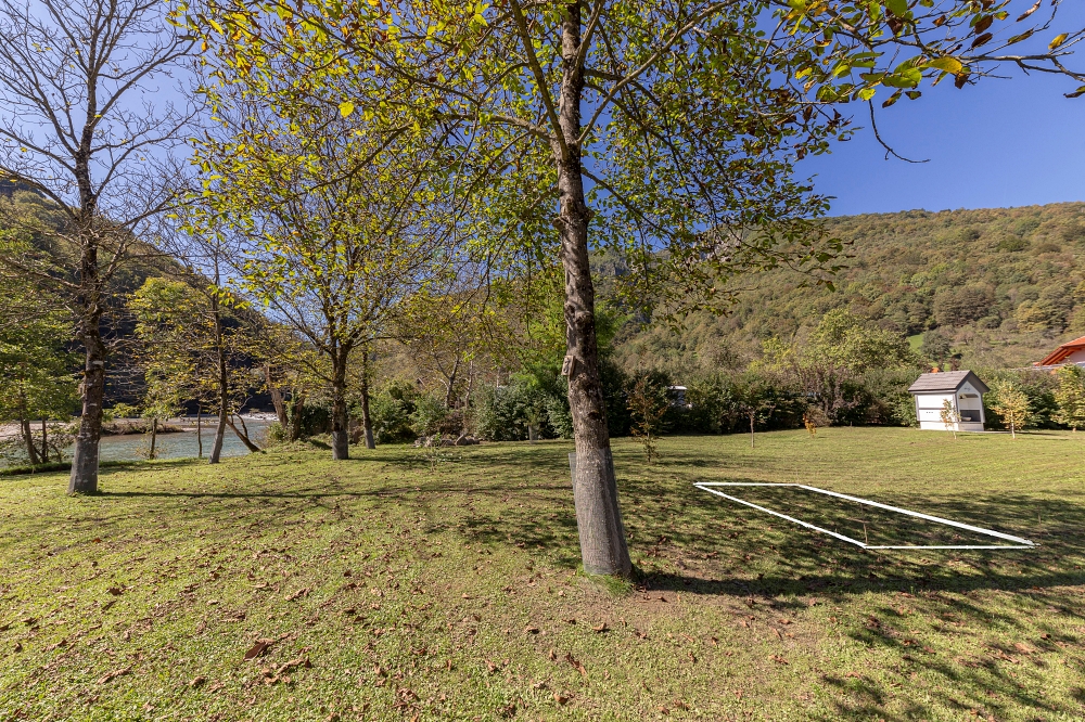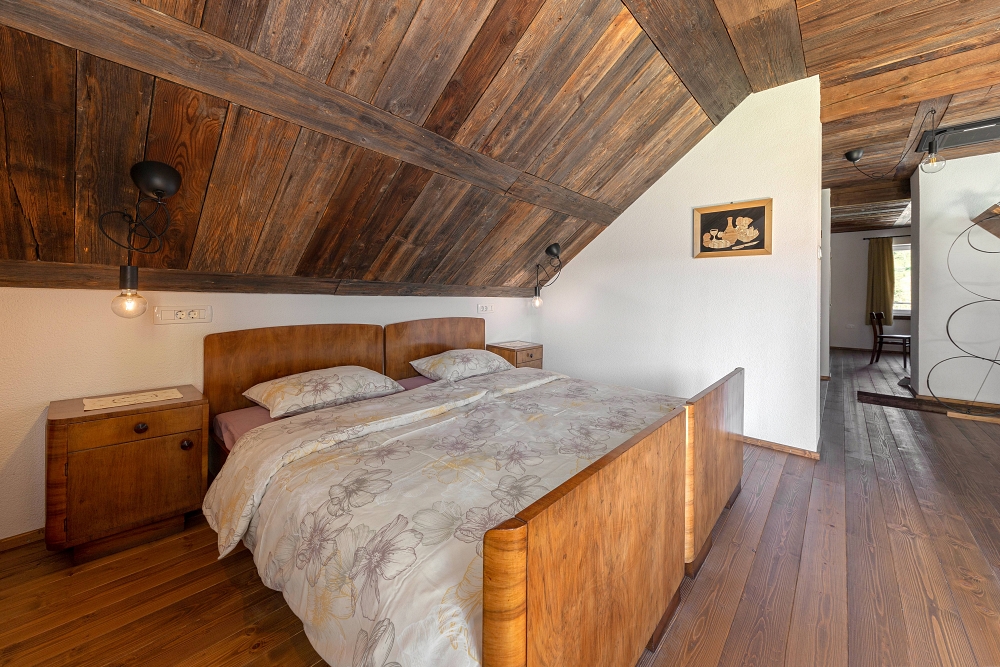 The living space (70 m2) includes 2 bedrooms, a kitchen, a dining room, a living room and a bathroom. The central part of the house is an open space occupied by the kitchen, the dining room and the living room. There are two distinct elements that connect all three rooms: the traditional brick oven and the hardwood floor made of recycled larch planks, which also decorate the kitcken cupboards. The traditional hardwood floor extends in both bedrooms which are also equipped with brick ovens and double beds. The attic is an open-space sleeping area (70 m2) with additional 2 double beds and 4 twin beds. The whole house is equipped with period furniture, some of which originally belonged to the house, however most of it is second-hand and fully restored. The terrace next to the kitchen offers wonderful views of a large garden which extends to the Kolpa River. A garage for storing bicycles and fishing equipment is also available to the guests. The garden is actually a motorhome area for three motorhomes with water, and electricity supply, free WiFi and enough parking space for all the guests.