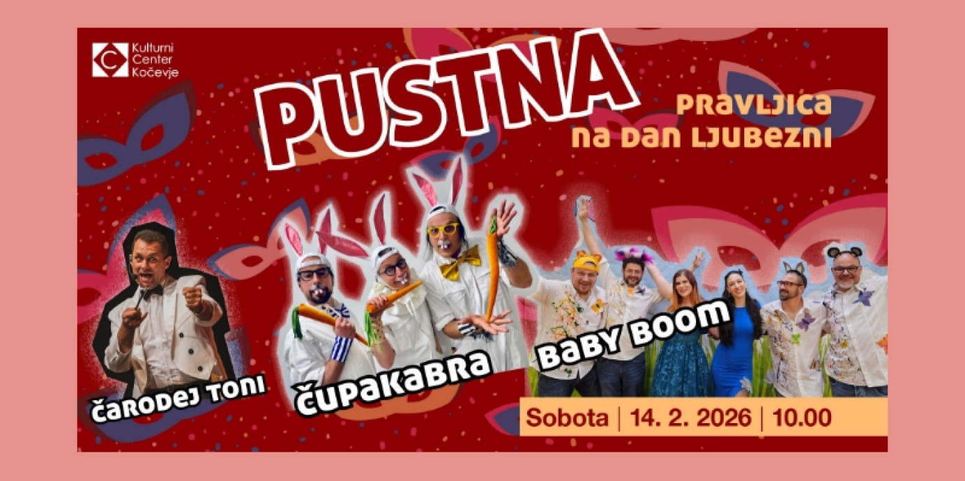 V soboto, 14. februarja 2026, ob 10.00, vse male maškare in njihove starše vabimo v KCK na čarobno pustno dopoldne, polno smeha, glasbe, čarovnije in pravljičnih junakov!