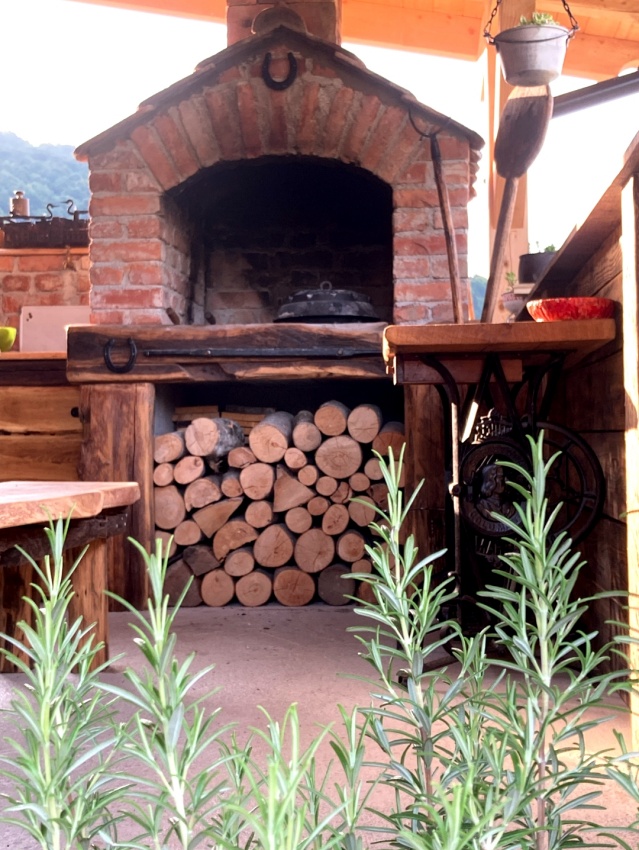 Na terasi je razpoložljiv tudi zunanji kamin za pripravo raznih jedi na žaru ali podpeko ter večjo jedilno mizo.